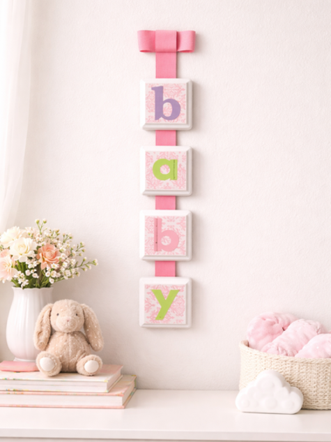 Not only is this a cute decoration for a baby shower, it's another great keepsake for the expecting mom. These small wooden blocks are from a local craft store. After painting them white and giving them ample time to dry, adhere your choice of cardstock to the front of the blocks and seal with Mod Podge. Once that is dry, add die cut letters and another coat of Mod Podge. Once the blocks are completely dry fasten the blocks to the ribbon using a heavy duty stapler, tie a pretty bow at the top and hang using a small finishing nail.