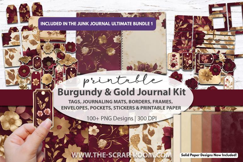This burgundy and gold printable junk journal kit adds a rich, elegant touch to any project. Deep floral tones and faux metallic accents make it perfect for wedding journals, scrapbook spreads, or handmade cards. The pages work beautifully as backgrounds, and the tags and ephemera are great for layering in junk journals or planners. Crafters who love luxurious, warm colors will especially enjoy this kit.