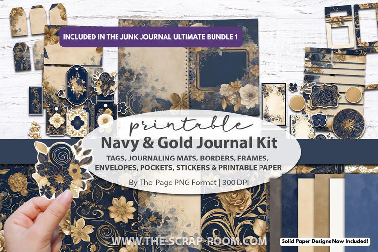 This navy and gold printable junk journal kit brings dramatic elegance to any project. The bold colors are perfect for travel journals, vibrant planners, wedding scrapbooks, or eclectic memory books. The pages work beautifully as scrapbook backgrounds, and the ephemera and journaling cards add pops of color to junk journals. Crafters who love strong, vibrant tones will especially enjoy using this kit.