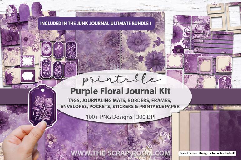 Elegant and romantic, this purple floral printable junk journal kit is filled with soft blooms and dreamy tones. It’s perfect for wedding memory books, bridal shower keepsakes, or journals celebrating love and friendship. The pages work well as scrapbook backgrounds, and the tags and ephemera are great for all your favorite paper craft projects. Junk journalers will enjoy pairing these designs with lace, vellum, and vintage-style embellishments for a delicate, feminine touch.