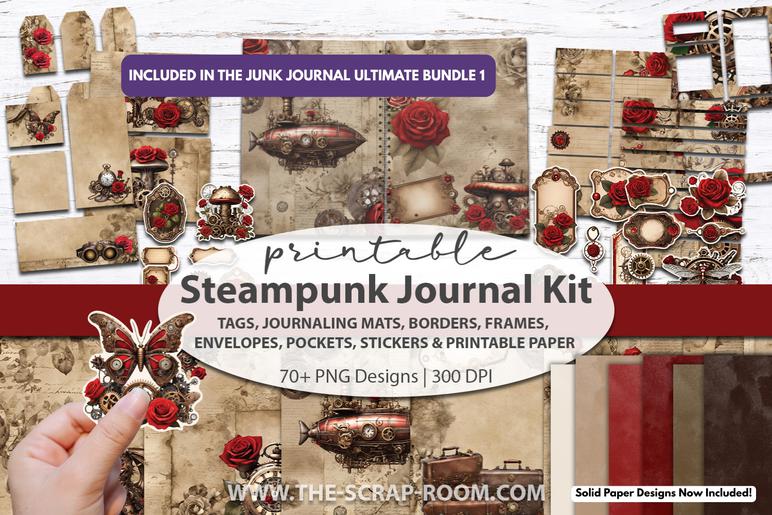 Unleash your creativity with the Steampunk Rose Junk Journal Kit, a captivating blend of gothic elegance and industrial flair. This digital download offers 24 high-resolution pages (8.5" x 11") featuring faux vintage textures, red rose florals, and steampunk-inspired elements like gears, clocks, and butterflies. Perfect for junk journalers, scrapbookers, and mixed media artists, this kit provides everything you need to craft unique, antique-style projects.